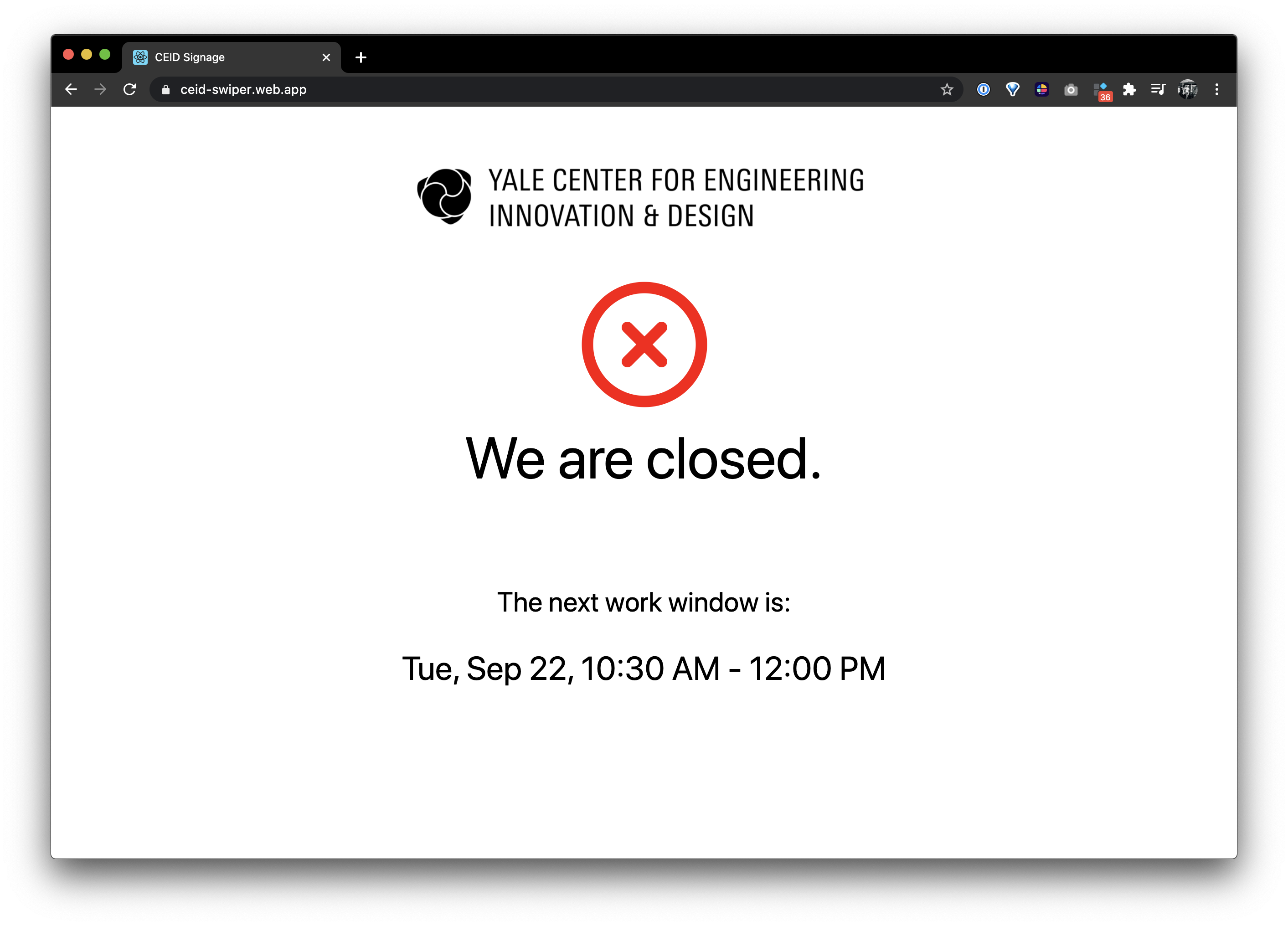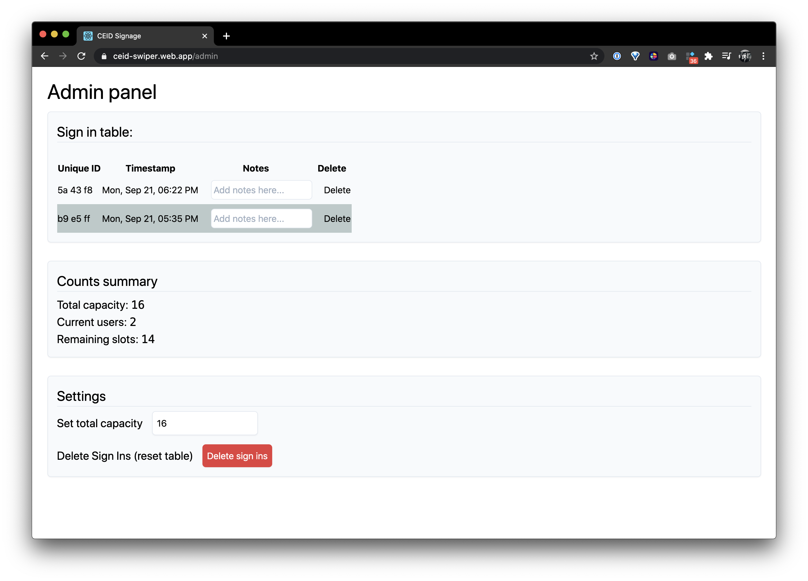 In addition to closing when capacity is reached, the signage is also programmed to close when a work window concludes (the schedule is created with Luxon). Lastly, an admin panel provides details for all members who have swiped into the space. At the end of each work window, an admin can clear the log to get ready for the next window.